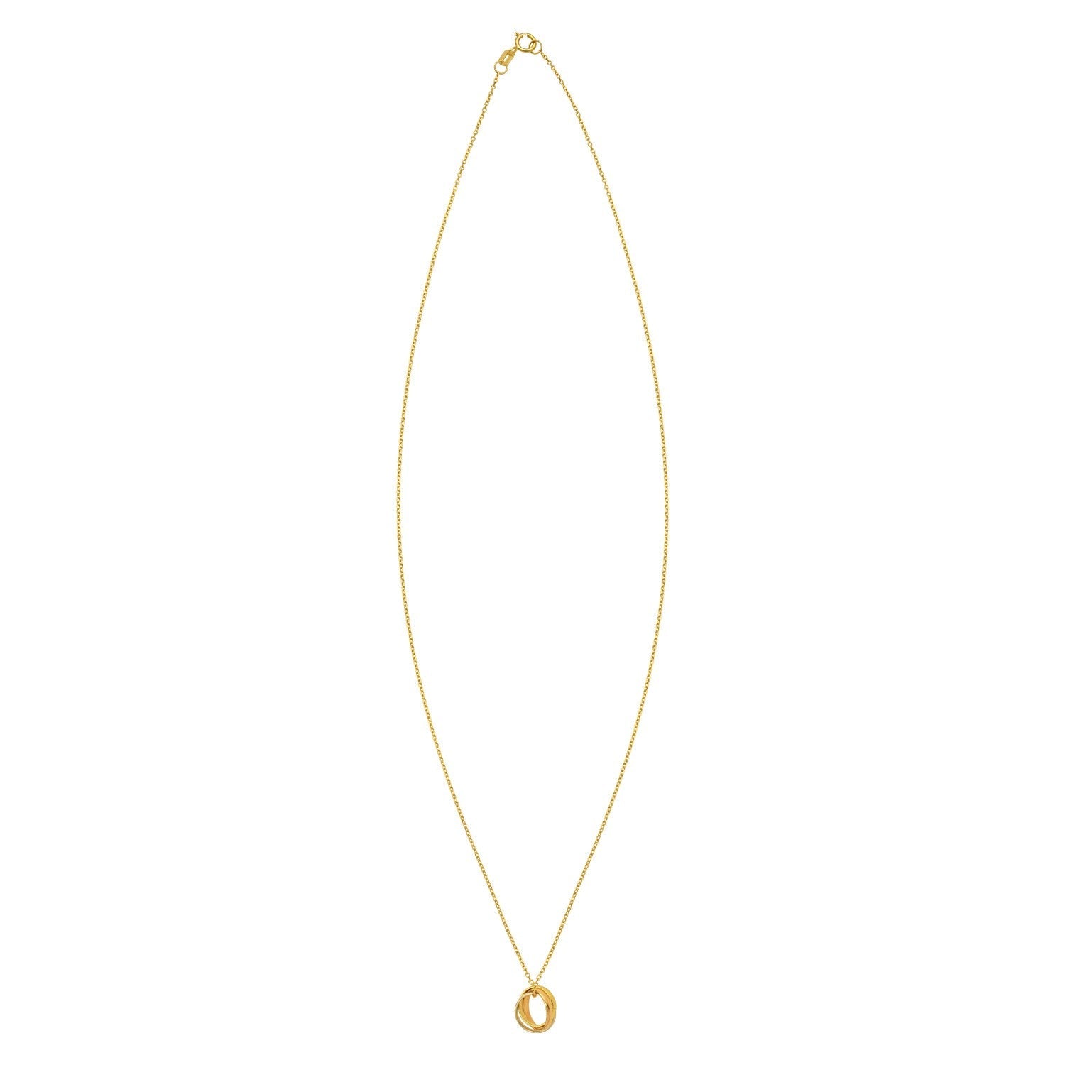 This 18 inches necklace features interlocking polished trinity elements crafted from 14K tri-color gold, symbolizing unity and harmony. Secured with a spring ring clasp, it offers both elegance and versatility, making it a timeless addition to any jewelry collection.