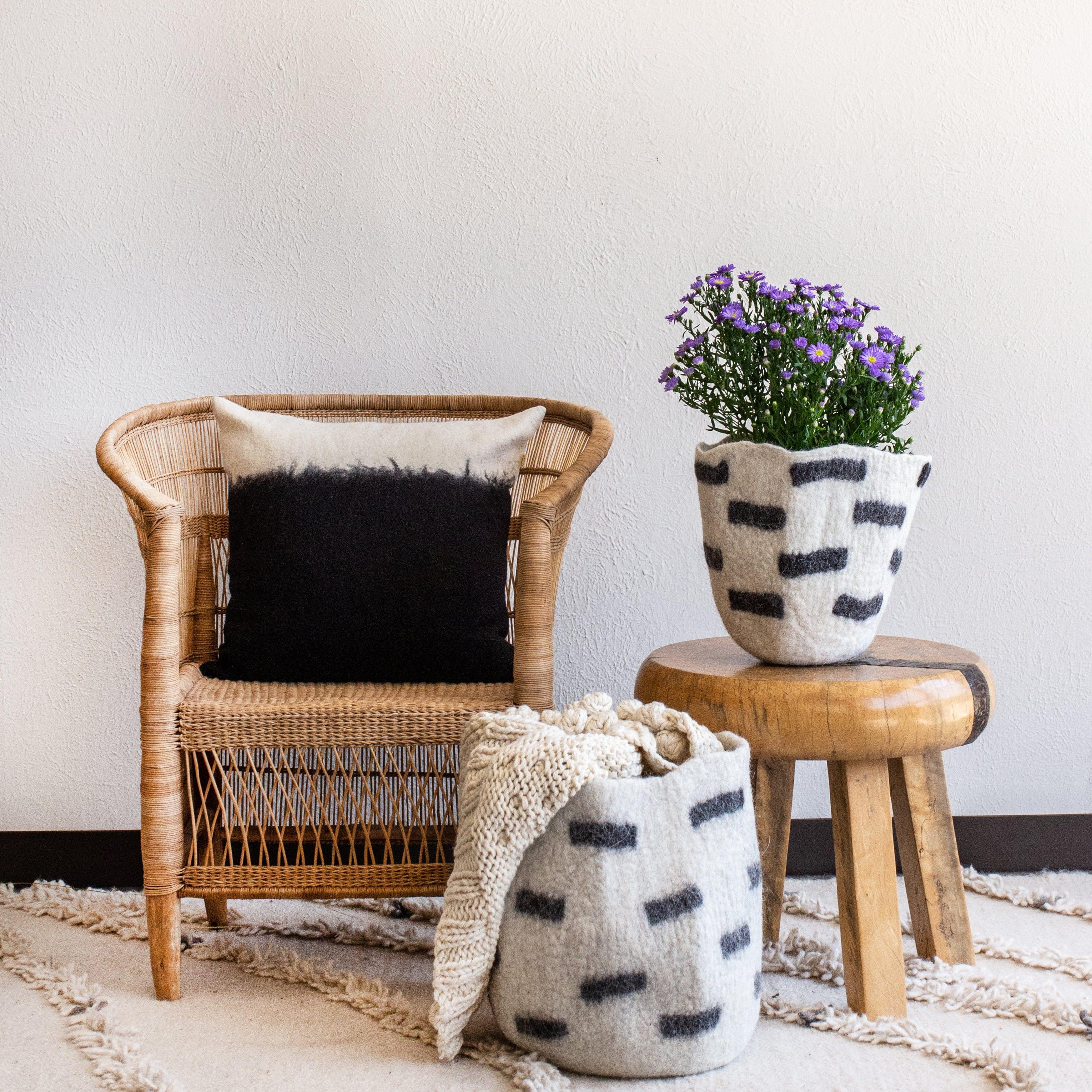 This contemporary basket is hand-felted using 100% Karakul wool, showcasing exceptional craftsmanship. Its versatile design and blendable pattern effortlessly fit into any room, adding a unique touch of style. The luxurious texture and distinctive pattern make it a standout piece, bringing warmth and character to your interior decor. Elevate your space with this stylish and modern basket that exudes both quality and charm.
